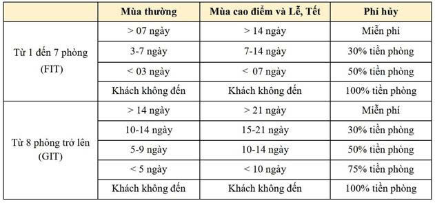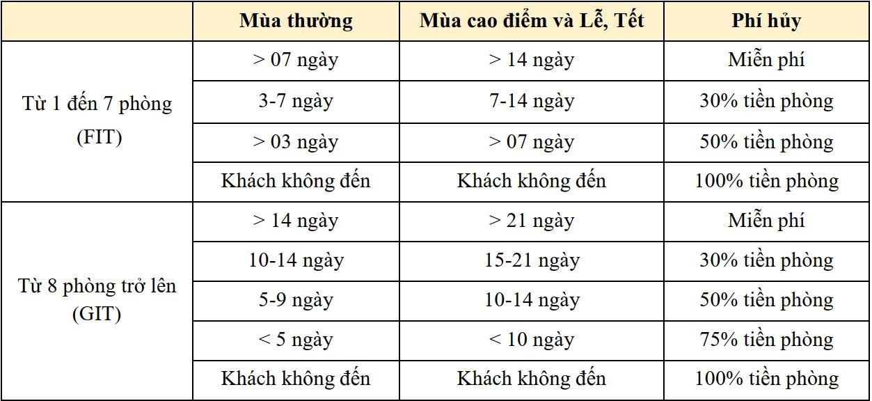 Mọi thông tin hủy và điều chỉnh dịch vụ chỉ có giá trị khi được xác nhận bằng văn bản qua email, không chấp nhận việc hủy và điều chỉnh qua điện thoại, tin nhắn. Phí phạt hủy phòng được áp dụng như sau: